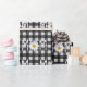 Mum text with white daisy flower and petals on white and black gingham pattern.