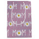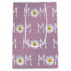 Mum text with white daisy flower and petals on pink and silver polka dot pattern background.