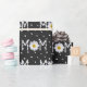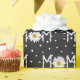 Mum text with white daisy flower and petals on white polka dots and black background.