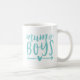 Are you a mother to a brood of boys? Celebrate your boy mum status with this cute mug featuring the saying "mum of boys" in vibrant turquoise aqua hand lettered typography with a heart and arrow illustration.