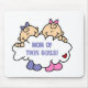 Our Mum of Twin Girls T-shirts, mugs, buttons, magnets, cards, tote bags, and other Mum of Twin Girls items features two adorable babies in pink and lavender sleepers holding a cloud that reads "Mum of Twin Girls!".