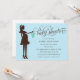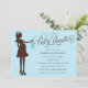 This baby shower invitation features the silhouette of a pregnant woman holding a mint green one piece baby outfit on a hanger. The words "baby shower" are written in brown script typography. Background is baby blue. Graphics ©revidevi.