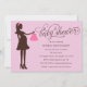 This baby shower invitation features the silhouette of a pregnant woman holding a pink dress on a hanger. The words "baby shower" are written in brown script typography. Background is baby pink. Graphics ©revidevi.