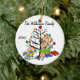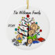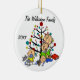 A pretty round ceramic keepsake Christmas holiday ornament features a stick figure family including a mum, girl, toddler boy, and sleeping baby boy as well as the family cat in front of a decorated Christmas tree with areas you can customise with your family name and the current year! This cute holiday keepsake ornament makes a great gift for the young family to commemorate a special year!