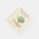 This custom baby shower napkin features a cute country farm animal theme. A gender neutral illustrated image of a mummy and baby duck are pictured walking beneath an apple tree. A little wooden picket fence is placed behind the tree and a big sun is shining over the ducks.