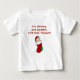 A baby wearing a red stocking cap inside a holiday stocking and red kid style text that reads "I'm Mummy and Daddy's Christmas Present!" on cute baby's first Christmas tote bags, Tshirts, and bodysuits!