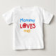 Mummy Loves Me T-shirts, long sleeve tees, bodysuits, organic bodysuits, sleeveless dresses, ruffle shirts, ruffle dresses, hats, raglan T-shirts, and other apparel for baby with blue, red, and gold text and heart design that reads Mummy Loves Me!
