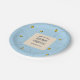 Cute baby shower paper plate for the Mummy to Bee, or Sweet as Can Bee for a baby boy, featuring lopping bumble bees on a cornflower blue background and personalised handwritten text for a name and date of the event.