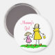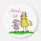 Mother and daughter hold hands. The mum's dress read "mummy" and the little girl's dress reads "me". The family has blonde hair and light skin. The image comes in multiple ethnic versions. There is also a no colour drawing version too. Change the words of "Mummy's Girl" and personalise the magnet with family names or a custom message for a special mother or mummy magnets! You can make a custom refrigerator art magnets for a special Mother's Day gift, new Mummy, Family Reunion or other customised family art gifts!