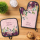 Looking for a cute, practical gift for your mother? Gift your mum these beautiful personalised floral oven mitts to display in her kitchen! This oven mitt set features florals pictured in dark red burgundy and blush pink, with added greenery. All text can be changed.