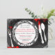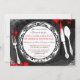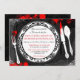 Murder Mystery Dinner Party Invite. This Halloween party invite features a dinner plate with damask black flourishes and offbeat skulls and silver glitter on the outer edges. The background is black with splashes of drips and a chandelier nestled among glitter. A great party invite for Halloween or dinner parties with a twist!