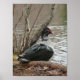 A photograph of a Muscovy duck sitting on a stick by the edge of a pond.
