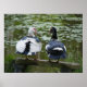 A photograph of two Muscovy ducks sitting on a garden ornament and staring out into the pond.