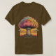 This t-shirt design showcases a striking and imaginative illustration of a mushroom cloud in vibrant, warm colours. The explosion is rendered with intricate linework and a gradient of colours ranging from deep purples and reds at the base to bright yellows and oranges at the top, mimicking a sunset. The mushroom cloud rises from a rugged, mountainous landscape, adding a sense of grandeur and scale to the image. The background features a serene sky with soft, horizontal stripes of orange and yellow, creating a beautiful contrast with the bold explosion. This unique design combines elements of fantasy and nature, making it a standout piece for those who appreciate artistic and imaginative apparel.