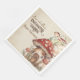 This custom party napkin features and enchanted garden baby shower theme. The background is a faded parchment paper design to resemble an vintage fairytale book. An image of a cute little mushroom house and pathway leading to an enchanted fairy garden is pictured on the right. Various flowers and mushrooms are placed along the pathway. Delicate fairy lights accent the top and bottom portions.