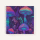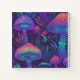 A vibrant and intricate design features glowing, mystical fungi rendered in an iridescent neon palette of violet, teal, magenta, and bright blue. The psychedelic mushrooms are surrounded by delicate, ethereal flowers and foliage, creating a truly whimsical and enchanting forest scene.