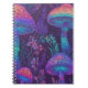 A vibrant and intricate design features glowing, mystical fungi rendered in an iridescent neon palette of violet, teal, magenta, and bright blue. The psychedelic mushrooms are surrounded by delicate, ethereal flowers and foliage, creating a truly whimsical and enchanting forest scene.