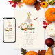 Nature storybook page inspired baby shower invitation featuring illustration of two mushrooms surrounded by butterflies and moth with two pumpkins.