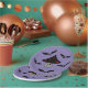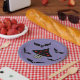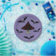 A cute cartoon vampire mushroom, with a black cap, red spots, and tiny fungal fangs. They are surrounded by vampire batshrooms on a purple background.