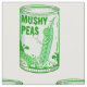 An illustration of a tin can of mushy peas. These mashed peas are a English food that is delicious. This design has a cartoon pea pod stomping on some peas, mushing them. A funny vegetable design which is part of my canned / tinned food collection.