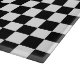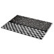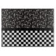 Fun retro look cutting board has a '50s diner jukebox vibe with the top panel of jumbled white musical notes on black background and a black and white chequerboard pattern bottom half.
