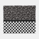 Fun fleece blanket design has a '50s diner jukebox vibe with the top panel of jumbled white musical notes on black background and a black and white chequerboard pattern bottom half.