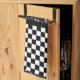 Fun kitchen towel design has a '50s diner jukebox vibe with the top panel of jumbled white musical notes on black background and a black and white chequerboard pattern bottom half.