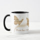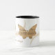 Silhouette butterfly images are filled with vintage music sheets on this pretty mug. Gold brown text at the bottom says "Music has wings", and your custom name is on the other side. Everything is placed on a white background, with a subtle gold star swirl among the butterfly images. Perfect for the musician, music teacher, or anyone who loves music!