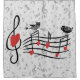 A modern and pretty music design featuring two love birds resting on a musical notes score with red love hearts on a subtle background pattern of musical notes on grey.