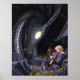 A young, red haired bard soothes a silver dragon, playing her harp by the light of his glowing eyes. They are sitting on the dragon's treasure hoard, which is filled with many things (jewellery, coins, crowns, the hood ornament of a 1937 Packard - normal stuff that dragons collect.) The dragon's talons, wing, and tail embrace his little music maker, and you can see the whole scene (including the artist) reflected in his shining scales. This was my first Dragon Magazine cover. The original was 17x22 inches.