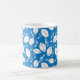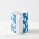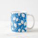 A jumble of white footballs and white music notes against a blue background is a unique music design for musicians, music teachers and students.