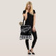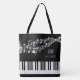 Personalised, custom colour tote bag featuring a piano keyboard and music staff with notes in your choice of graphics and background colours (shown in white on black) with a monogram or initials and/or name or other text in your choice of font styles and colours to create your own custom look. The design is duplicated on the back so if making changes, manually change on the back too in EDIT. OPTIONS: The sample is shown in the LARGE 18x18" size--other sizes available on the ordering page. ASSISTANCE: For help with design modification or personalisation, colour change, transferring the design to another product or if you would like coordinating items, contact the designer BEFORE ORDERING via the Zazzle Chat MESSAGE tab below or email makeitaboutyoustore@gmail.com.