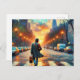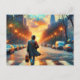 This image depicts an artistic, colourful painting of a person walking down a city street at what appears to be sunset or sunrise. The individual is centred in the composition, wearing a long coat and a hat, carrying a guitar case. The street is lined with parked cars and illuminated by street lamps, with buildings rising on either side. The sky is ablaze with warm hues of orange, yellow, and blue, suggesting the beginning or end of the day.