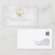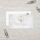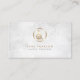 This elegant professional music teacher business card features an elegant marble texture background. A gold french horn icon appears on the top half of the card. Your name and title appear in the lower middle section, below the gold monogram square. Perfect for professional, entertainment, showbusiness, concerts, talent, music, musician themes.