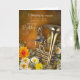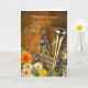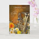 The card’s front features a shiny brass instrument surrounded by yellow, white, cream and orange floral elements, against a deep warm rustic golden-brown background.