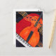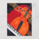 Music staff and notes float above a cello and piano in intense reds and golds. The keyboard stands out in contrast with the bold colours and dark background.