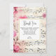 Thank you card with a elegant and whimsical design. Music sheet decorated with a big pink heart and pink roses and wildflowers around the edges.