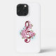 Pink treble clef with delicate, detailed pink Japanese cherry blossoms against white background painted over with light blue paint. Blooming pink sakura.