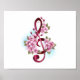 Pink treble clef with delicate, detailed pink Japanese cherry blossoms against white background painted over with light blue paint. Blooming pink sakura.