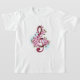 Pink treble clef with delicate, detailed pink Japanese cherry blossoms against white background painted over with light blue paint. Blooming pink sakura.