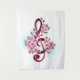 Pink treble clef with delicate, detailed pink Japanese cherry blossoms against white background painted over with light blue paint. Blooming pink sakura.