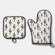 Cute oven mitt and pot holder set, with a simple treble clef pattern on a white background. A fun musical item to add a touch of classical music to your kitchen and cooking supplies.