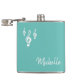 Trendy musical flask, with a treble clef pattern and white script typography. Set on a teal green background, this item has customisable lettering where your can add your own text. A fun music inspired item to celebrate in style.