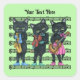 This square sticker has three black cats wearing pink, blue, and green bows and ties playing musical instruments including a violin, guitar, and saxophone standing on a sheet of black music notes on light green background.