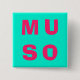 A modern pin button with text design of the word 'muso' (a musician or music lover). The capital lettering is in fuchsia pink on a contrasting aqua background. Stay in tune with musical style and spark conversations with this bold and quirky accessory.