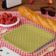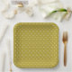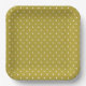 Pattern of white polka dots on a mustard yellow background. The dots are evenly spaced, creating a simple, vintage, playful aesthetic.