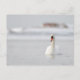 Mute swans swimming in the ice cold water with icy and snow covered island on the background postcard.