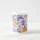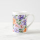 Muted watercolor style flower pattern of pink, orange, lavender flowers with green leaves on a mint background.