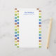 From the desk of stationery with colourful striped borders in muted colours of brown, yellow, green, and blue personalised with your name in blue. Blue and green colourful personalised stationery printed with your name beneath From the desk of.