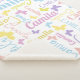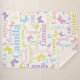 Cute little graphic outline butterflies personalised name blanket. This muted soft purple, blue, pink, green, yellow and coral text typographical blanket can also be customised with your own short name, currently reads Camila. Other names and colours available or contact me for name requests. Original art and design by Sarah Trett for www.mylittleeden.com